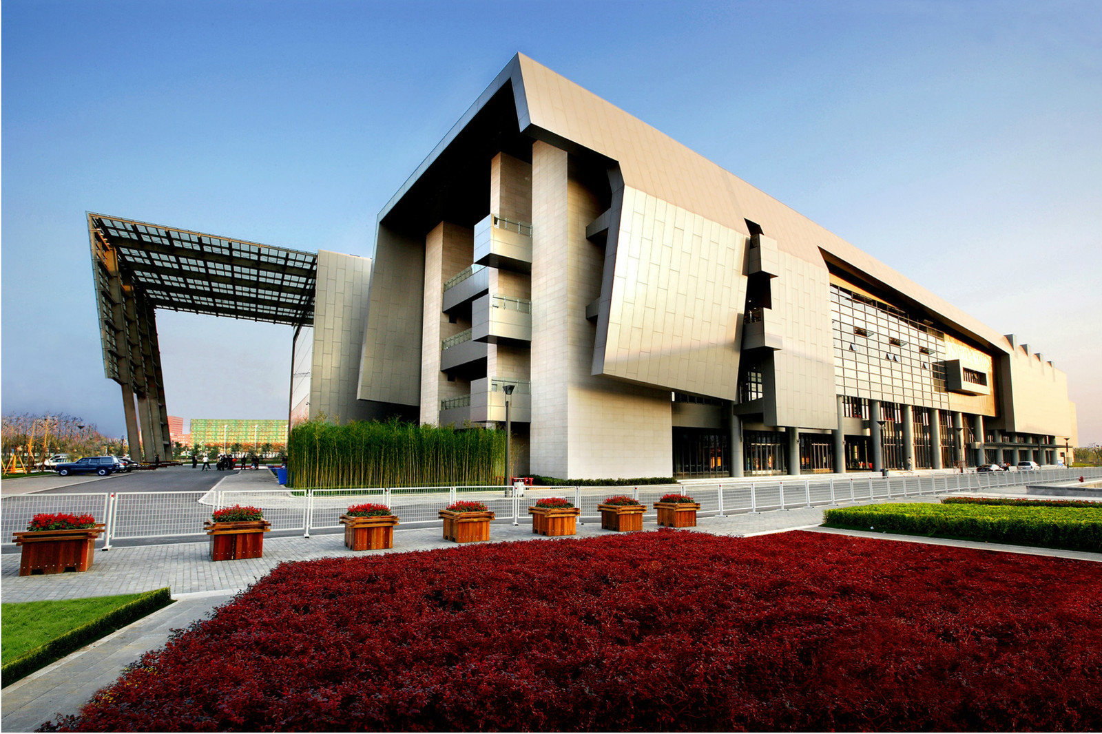 南京會(huì )議展覽中心會(huì )議中心工程坐落于南京市白龍江西街5號,由南京市河西新城區國有資產(chǎn)經(jīng)營(yíng)(控股)有限責任公司投資建設,南通新華建筑集團有限公司主承建施工,美國TVS公司設計。工程建筑面積44086㎡,地上4層,地下1層,建筑總高度27.6 m,于2007年 1月5日開(kāi)工,2008年8月30日竣工,2008年9月27日驗收并交付使用。會(huì )議中心集會(huì )議、展覽、演出、宴會(huì )等多功能于一體,內設一個(gè)800座多功能報告廳,20個(gè)中小型會(huì )議室,一個(gè)6500㎡的室內多功能展廳,一個(gè)1600㎡的宴會(huì )廳等,擁有展覽和會(huì )議兩大功能,分為會(huì )議中心、展館和配套服務(wù)設施三部分。從空中俯瞰,會(huì )議中心猶如臥虎,展館依次向南蜿蜒成龍身,寓意為“虎踞龍蟠”,頗為壯觀(guān)。 工程基礎采用C30鉆孔灌注樁, C80預應力高強砼管樁。主體為框架及鋼砼組合結構,其中4根矩形獨立柱高24m,臺口預應力轉換梁跨度27m,斷面900×4500,支模凈高 16.8m,鋼箱梁跨距38m,9號多功能展廳鋼桁架最大跨長(cháng)80.5m,鋼桁架高3.8m;門(mén)廳結構用鋼500噸,屋面梁與鋼柱呈L形,斜柱柱角埋入砼地梁;鋼屋蓋為鋁鎂錳合金板金屬屋面系統。外墻采用拉索點(diǎn)支式玻璃幕墻組合幕墻、剛性點(diǎn)支式玻璃幕墻等系統墻體采用聚苯乙烯泡沫塑料,門(mén)窗采用雙鋼化中空玻璃,屋面和展廳地面分別設40mm、30mm厚擠塑型聚苯板,采用集中采暖系統、建筑設備自動(dòng)監控系統,符合現代節能、健康綠色建筑“可持續發(fā)展”的建筑理念。室內裝飾藝術(shù)異型吊頂眾多,頂棚有石膏板、成品木質(zhì)吸音板,墻面有干掛石材、進(jìn)口木飾面、高級飾面墻布、吸音板、乳膠漆等,樓地面有啞光花崗巖、地磚、晶面地面、木地板、地毯等。設備功能齊全,配置12臺日立中高速電梯,設有給排水、通風(fēng)空調、變配電、燈光照明控制、火災自動(dòng)報警及聯(lián)動(dòng)控制系統、多媒體會(huì )議系統、甲級智能化系統。 在施工過(guò)程中,始終堅持“對社會(huì )對人民負責、靠品德靠技術(shù)造樓”的職業(yè)準則,踐行“精、細、嚴、實(shí)、突”的管理思路,各項管理嚴格有序,工程質(zhì)量處于行業(yè)領(lǐng)先水平,先后獲2008年度南京市優(yōu)良工程,2009年度南京市“金陵杯”獎,江蘇省“揚子杯”獎,國家優(yōu)質(zhì)工程“魯班獎”,2007年度南京市、江蘇省建筑施工文明工地。 工程自竣工使用近一年來(lái),已成功舉辦200多場(chǎng)活動(dòng),中國住房和城鄉